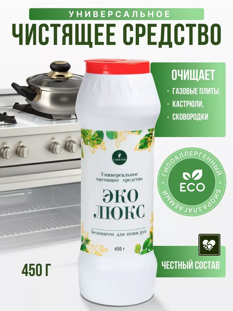 Чистящий порошок ЭКОЛЮКС от Сафэко - это универсальное чистящеесредство для уборки дома, предназначенное для ухода за ванной комнатой и кухней.Чистящее средство для ванн, чистки душевых кабин, раковин, для кухни, для уборки дома. ЭКОЛЮКС с эффектом антиналет для чистки ванны, средство против ржавчины и антижир для кухни отлично очищает ванну, раковину, душевые кабины, унитазы, газовые плиты, кастрюли, сковородки от жирных и пригоревших пятен не оставляя следов и царапин. Средство для кухни, чистящее средство для ванн бытовая химия для дома создадут уют и порядок в вашем доме. За счет содержания активных чистящих веществ в порошке, он эффективно справится даже с застарелыми загрязнениями. Средство для уборки кухни, ванн, для удаления ржавчины; от известкового налета очищает поверхности, удаляет жир и въевшиеся грязи. Порошок для уборки подходит для многих поверхностей: кафель, фаянс, хром, эмаль. Моющее средство ЭКОЛЮКС биоразлагаемое, не содержит агрессивных компонентов, абразивных веществ, хлора, фосфатов, агрессивных ПАВ. Чистящие средства для уборки нашего бренда подходят для ванных комнат, сантехники, душевых кабин и кафеля; от подтеков, ржавчины, мыльных разводов, солевых отложений, от известкового налета. Приобретая чистящие и моющие средства от САФЭКО, подарите себе уют и комфорт в доме. Чистота и порядок украшают жилище и становятся его визитной карточкой. Основным критерием для выбора чистящей продукции является ее безопасность для здоровья человека и окружающей среды. Безопасный и биоразлагаемый состав:карбонат натрия,карбонат кальция,кокосульфат натрия.
