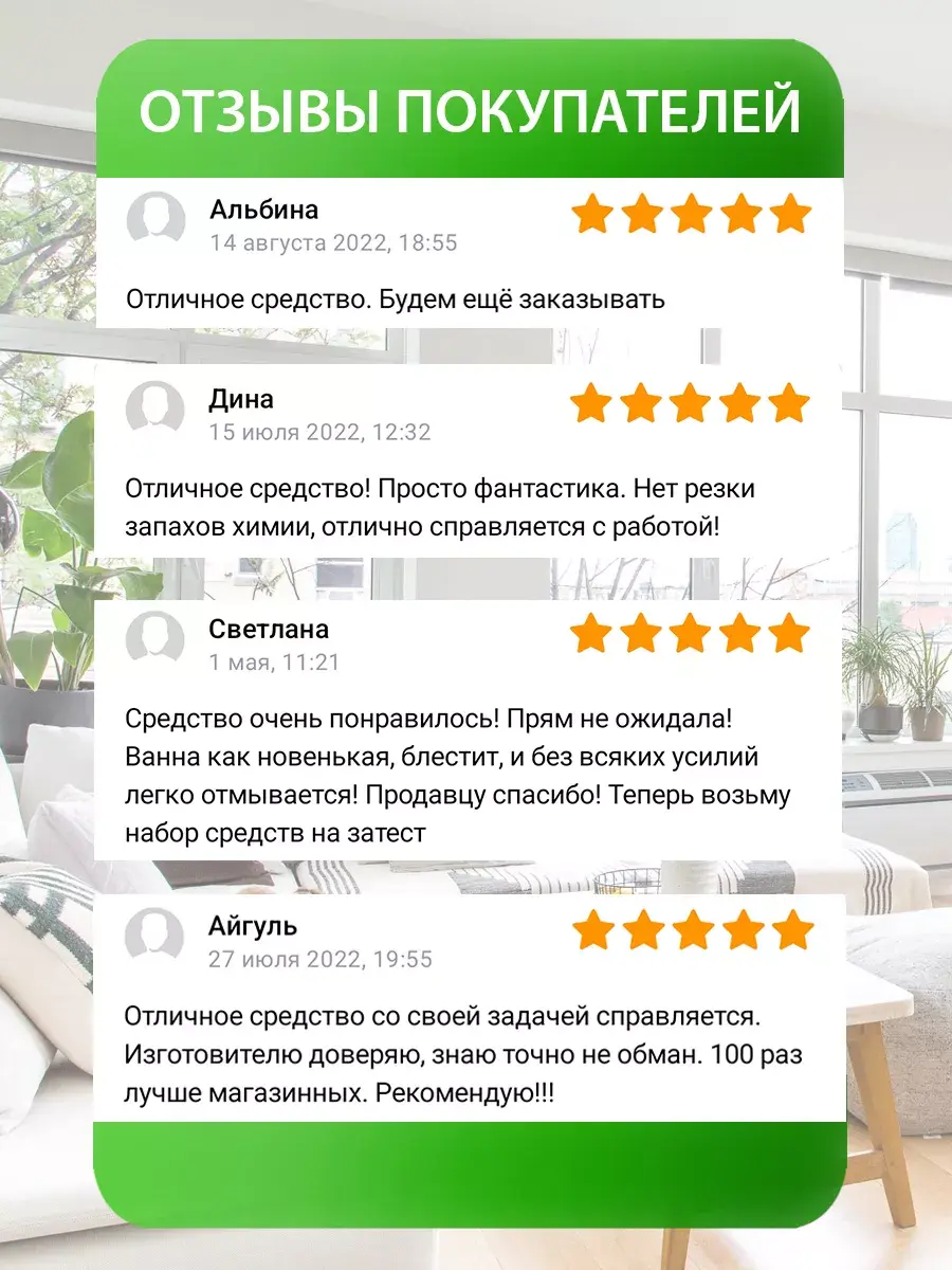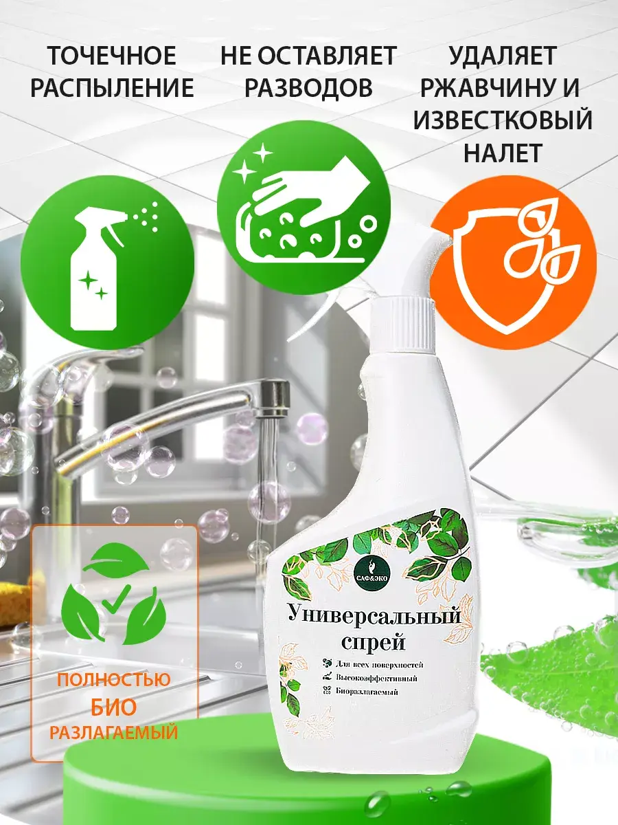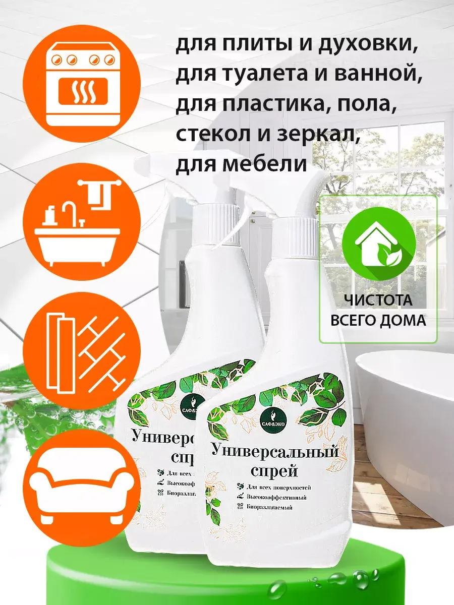 Инновационное eco биоразлагаемое средство для уборки дома и на даче. Жидкость в виде спрея с эффектом антижир подходит для кухни и избавит от жира кухонные изделия, посуду, раковину, плиту (индукционную, керамическую, газовую, из стеклокерамики). Полностью смываемый и безопасный для человека и животных. Отличный жироудалитель для духовки. Многофункциональный спрей антиналет с помощью тряпочки из микрофибры поможет эффективно справиться с плесенью и грибком в туалете и ванной комнате. Создаст чистоту и блеск, эффективно удалит ржавчину и известковый налет с эффектом антикальций в труднодоступных местах, сантехники, унитаза и раковины, а также следы от жизнедеятельности человека на пластике. Многофункциональный чудо очиститель анти жир удалит даже въевшиеся пятна. Универсальный эко растворитель очищает пол от и грязи без разводов, не оставляя следов и бактерий. Дезинфицирующий cleaner для мытья полов эффективно соберут пыль и шерсть животных, при этом не раздражая слизистую питомца при вдыхании. Жидкость может быть использована как стеклоочиститель для мойки стекол, зеркал и пластиковых окон. Не оставляет резкого запаха химии после уборки. Обширное применение и чадящий состав позволяет использовать клинер для акриловых ванн, душа и и душевых кабин, джакузи. Является мощным очистителем микрофлоры в писсуаре, унитазе и биде. Хозяйственные товары для дома нашего бренда способны влюбить вас в уборку! Биоразлагаемый состав не содержит агрессивных компонентов - абразивных веществ, хлора, фосфатов, агрессивных ПАВ. Эко бытовая химия заботится о чистоте вашего дома, возвращая первозданную чистоту и блеск, сохраняя эффект на несколько дней. Не требует усиленного механического воздействия на поверхность - достаточно протереть тряпкой для уборки (из микрофибры, безворсовой), любой губкой через пару минут после нанесения и смыть водой. Не придется использовать жесткие щетки, достаточно мягкой тряпочки или салфетки.