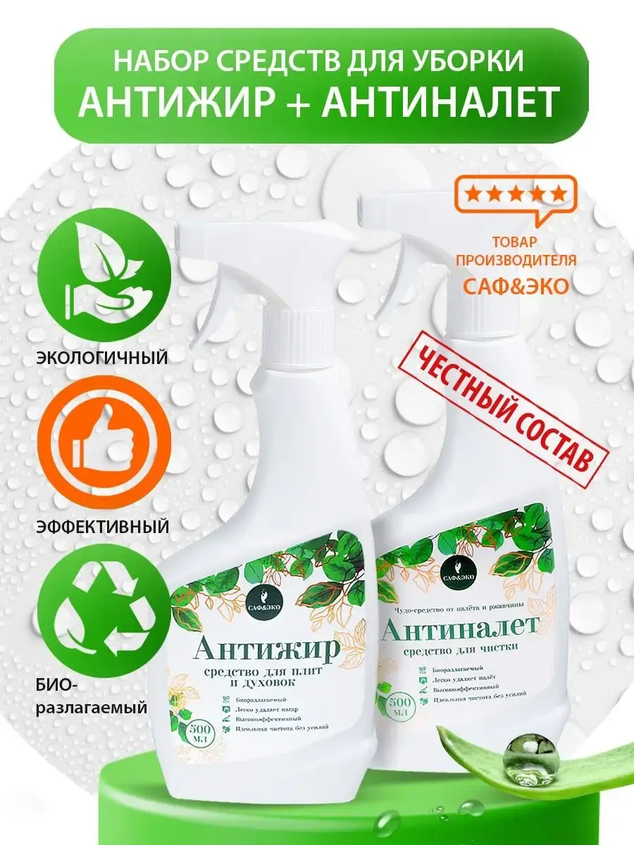 Высокоэффективный eco набор биоразлагаемых средств для уборки дома и на даче. В комплект входит два помощника из серии бытовой химии. 1) С эффектом Антижир для кухни избавит кухонные изделия, раковину, посуду, плиту (индукционную, керамическую, газовую плиты, из стеклокерамики) от загрязнений. Полностью смываемый и безопасный для человека и животных. Жироудалитель без труда с помощью губки избавит духовку о нагара и налета. 2) Многофункциональный антибактериальный спрей Антиналет поможет целенаправленно справиться с плесенью и грибком в туалете и ванной комнате. Создаст чистоту и блеск, удалит ржавчину и известковый налет с эффектом антикальций с помощью тряпки для мытья. Справится даже в труднодоступных местах сантехники, раковины, ванн, уничтожиив следы от жизнедеятельности человека на пластике, напрмер унитазе. Многофункциональный чудо очиститель анти жир унижчтожит с металлических поверхностей вьевшиеся и застарелые пятна. Универсальное моющее не оставляет резкого запаха химии после уборки. Для равномерного распределения чистящей жидкости имеет инновационную насадку пенообразователь. Для достижения нужного эффекта рекомендуем использовать салфетку (безворсовую, из микрофибры) или тряпочку. Обширное применение эко растворителя и чадящий состав позволяет использовать клинер для биде, писсуара, душа и и душевых кабин, джакузи. Является мощным уничтожителем патогенной микрофлоры. Хозяйственные товары для дома нашего бренда способны влюбить вас в уборку! Все для дома в одном наборе гаджетов для дома.