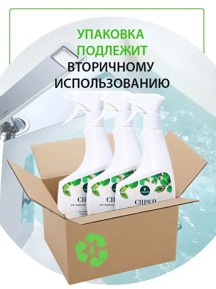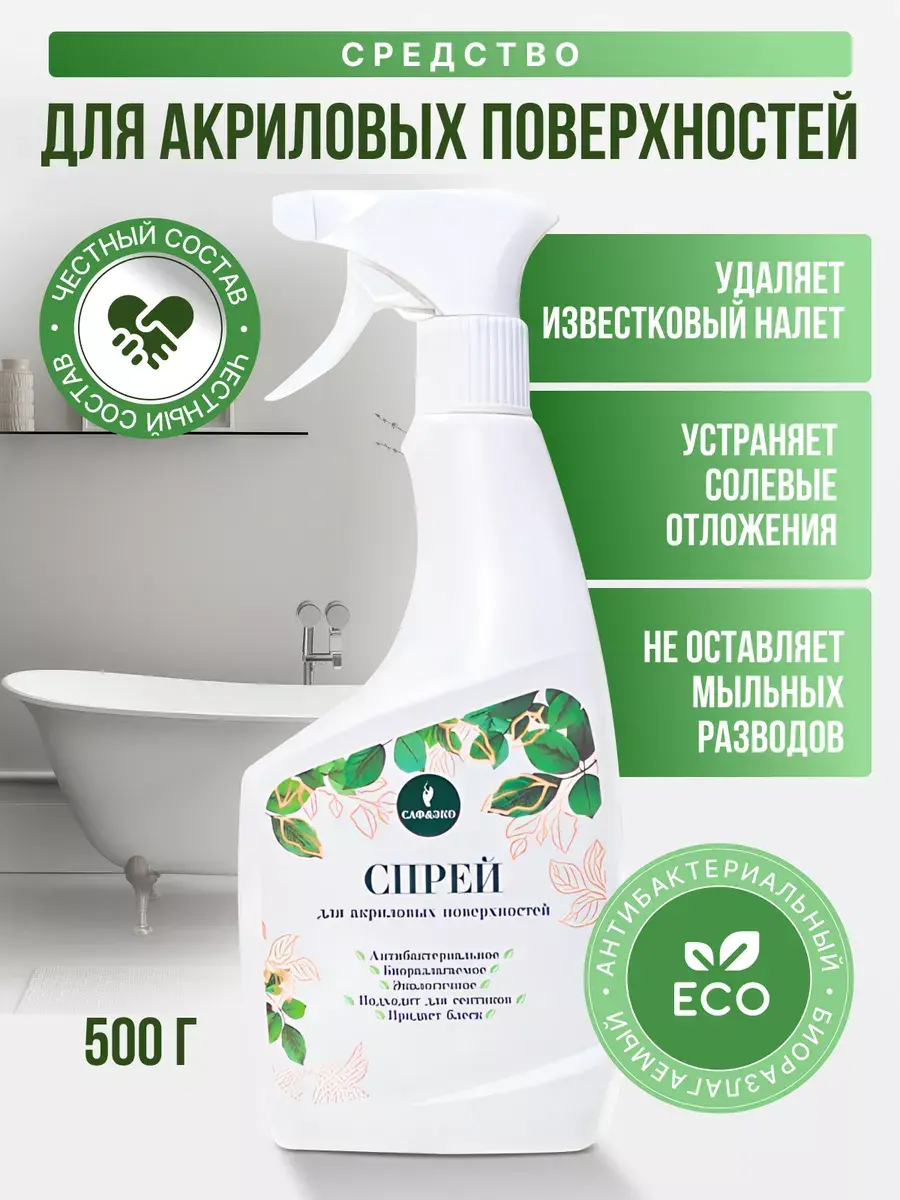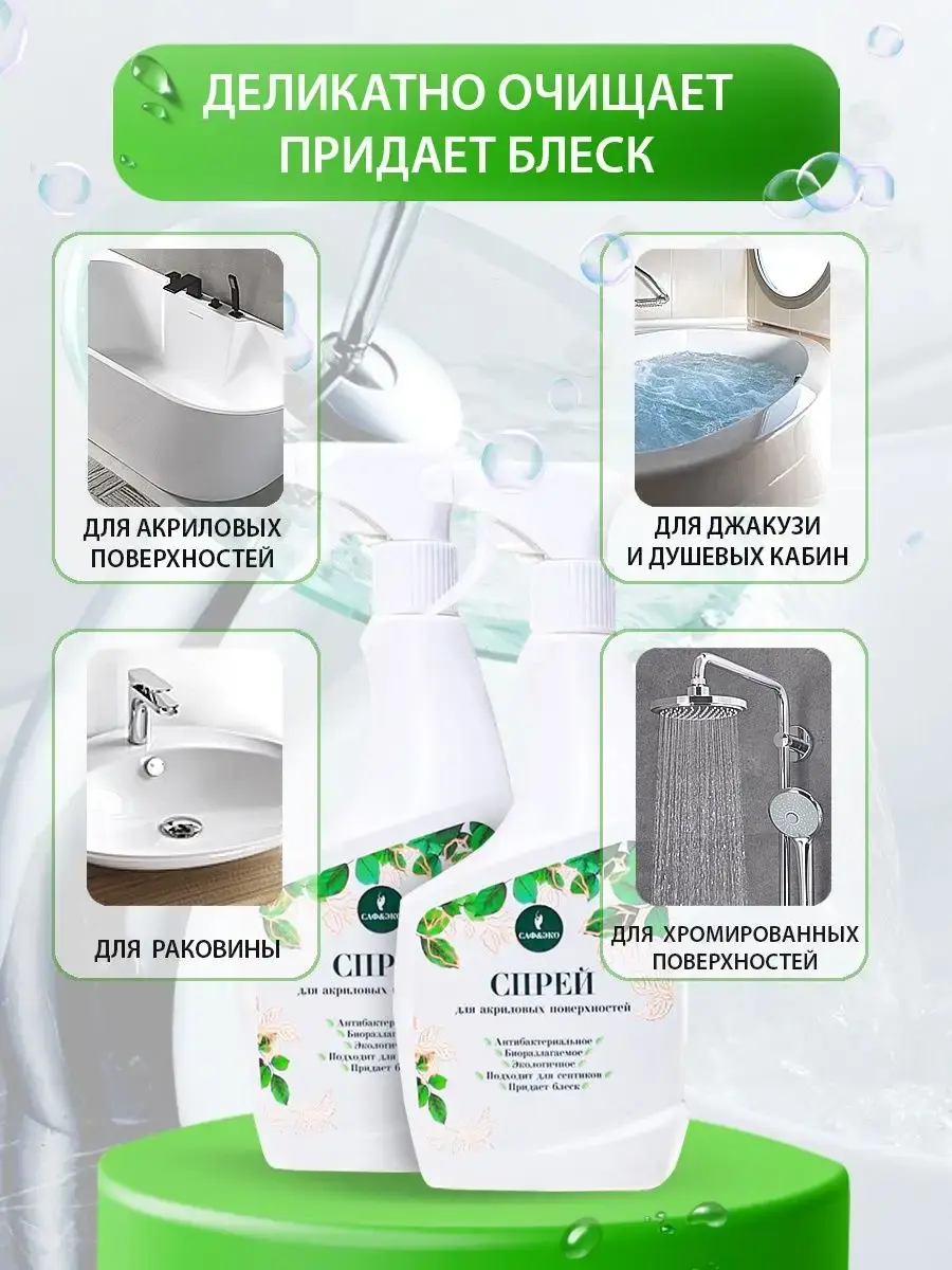 Инновационное эко средство для чистки и мытья акриловых ванн и пластиковых поверхностей, сантехники САФЭКО. Подходит для уборки джакузи, раковины, сантехники, душевых кабин в ванной комнате и туалете, бассейна. Сбалансированный состав обеспечивает эффективное удаление известкового налёта, ржавчины, солевых отложений и мыльных разводов, пятен, плесени и грибка. Антибактериальное эффективно удаляет сложные и застарелые загрязнения с эффектом антиржавчины и антиналет. Универсальное безопасно для изделий из стеклокерамики, раковин из нержавеющей стали. С помощью eco мойки даже генеральная уборка дома и на даче проходит легко и быстро. Безопасный и биоразлагаемый состав кислородного чудо очистителя с эффектом анти ржавчины не содержит агрессивных компонентов - абразивных веществ, хлора, фосфатов, агрессивных ПАВ. Бережно заботится о ванной и туалете, возвращая первозданную чистоту и блеск, сохраняя эффект анти ржавчина на несколько дней. Дезинфицирующая жидкость не содержит хлора и щелочных веществ и щадяще действует даже для пластика, например крышка унитаза. Формат спрея обеспечивает комфортное и равномерное нанесение. Не требует усиленного механического воздействия при чистке, для более равномерного распределения по поверхности достаточно воспользоваться тряпочкой, салфеткой (безворсовой, из микрофибры) или губкой. Используйте качественные моющие ведь это один из пунктов санитарно-гигиенических норм. Основным критерием для выбора набора чистящих хозяйственных товаров является безопасность для здоровья человека и окружающей среды, чем и отличается продукция Сафэко от более агрессивной бытовой химии.